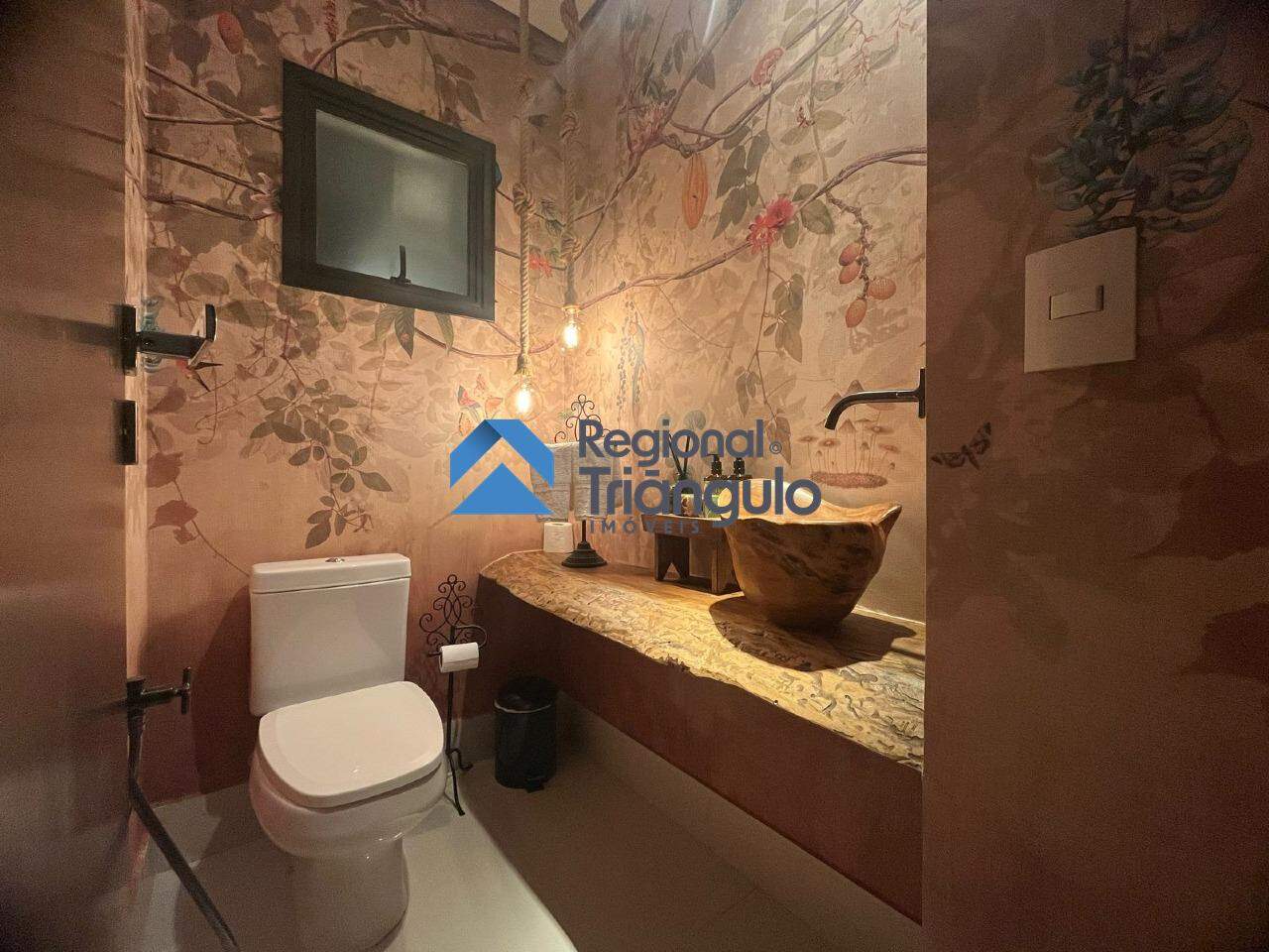 Lavabo com cuba esculpida e papel de parede assinado